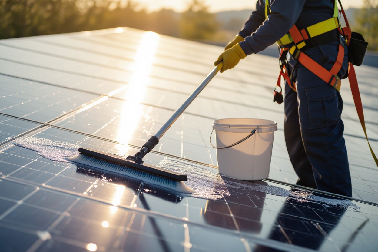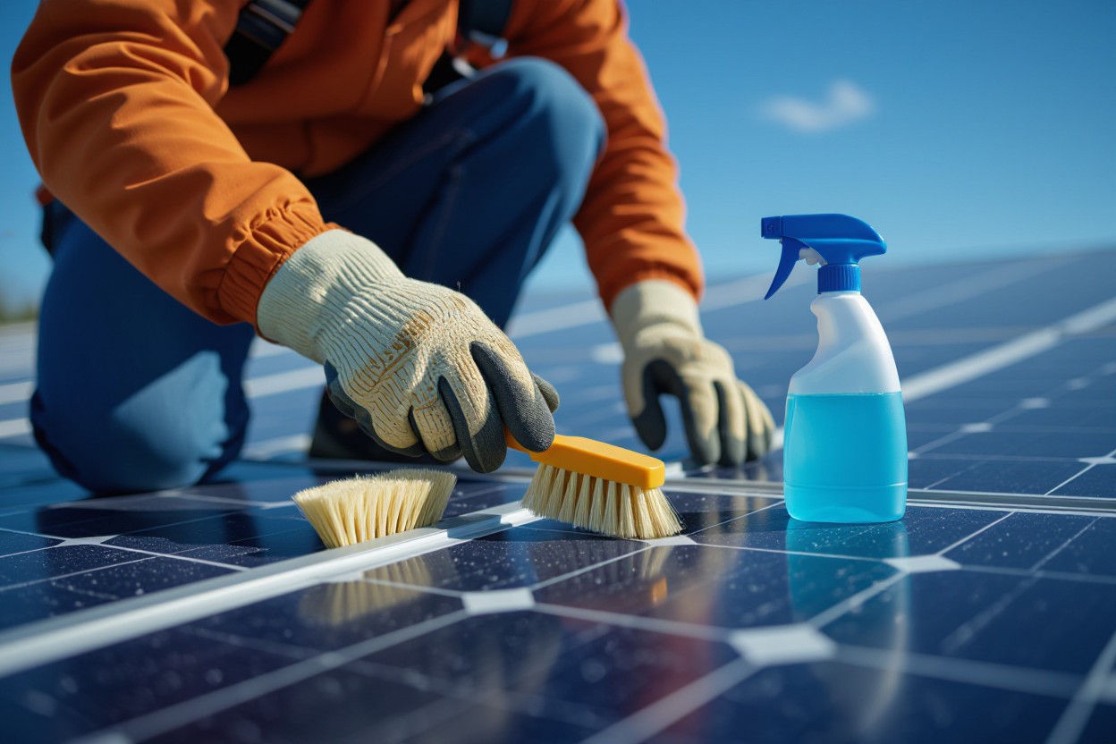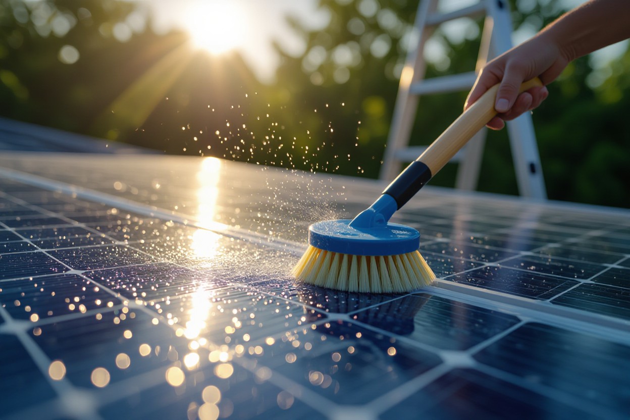 Establish a cadence based on local conditions: every 6–12 months for suburban sites, every 3 months in dusty, agricultural, or coastal areas, and immediately after heavy pollen events or construction dust. Track your system’s production with monitoring software—if energy falls roughly 3–5% below expected output on clear days, inspect and clean your panels. When you clean, work in the cool hours (early morning or late afternoon) to avoid thermal shock, use de-ionized water and a soft-bristle brush on an extendable pole, and apply a diluted pH-neutral cleaner or an approved hydrophobic solution to help soils shed and extend time between visits.